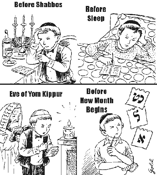 1. Every week before Shabbos 2. Every night before going to sleep 3. On the eve of Yom Kippur 4. Before each new month begins