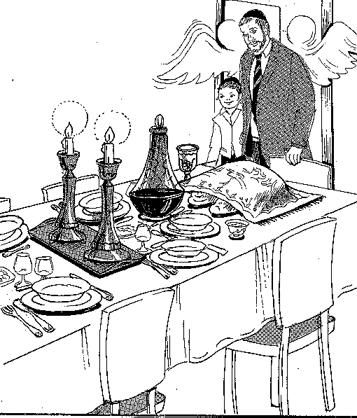 As the family (returns) from Shul, two angels accompany them into their beautifully lit home. The father blesses his children, and the family sings Shalom Aleichem. The (angels smile) and bless this home.