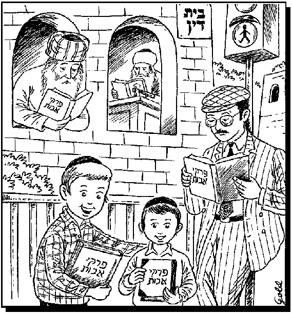 The green light is flashing. It is our signal to begin. Go ahead. Learn The Chapters of the Fathers. Look at these young boys, older boys, men and scholars. All are busy studying its lessons of how good people behave. Each "mishnah" is a lesson taught by a Tanna - a teacher - who learned how to behave from his teacher, back to the greatest of all teachers, Hashem. As we learn, let us try to make these lessons part of our lives.