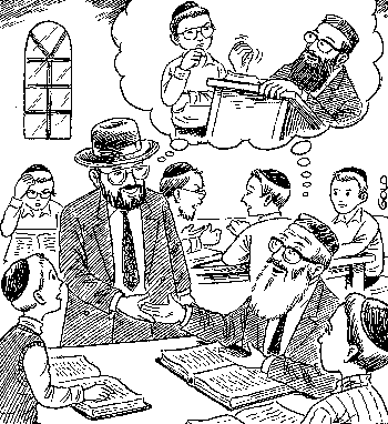 The man standing was once a student of this elderly teacher. Sitting in the Bais Medrash (Study Hall) with his young students, he remembers that not long ago he taught this man as a boy. His smile shows us that the is proud of him.