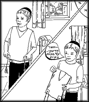 Although most brochos are said before a person does the mitzvah, the bracha for Tzitzis is said while the Tzitzis are held in the hand. Therefore, the Tzitzis should be unfolded and the "beged" (garment) should be spread out and carefully looked at, before the bracha is said.