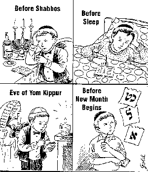 1. Every week before Shabbos 2. Every night before going to sleep 3. On the eve of Yom Kippur 4. Before each new month begins
